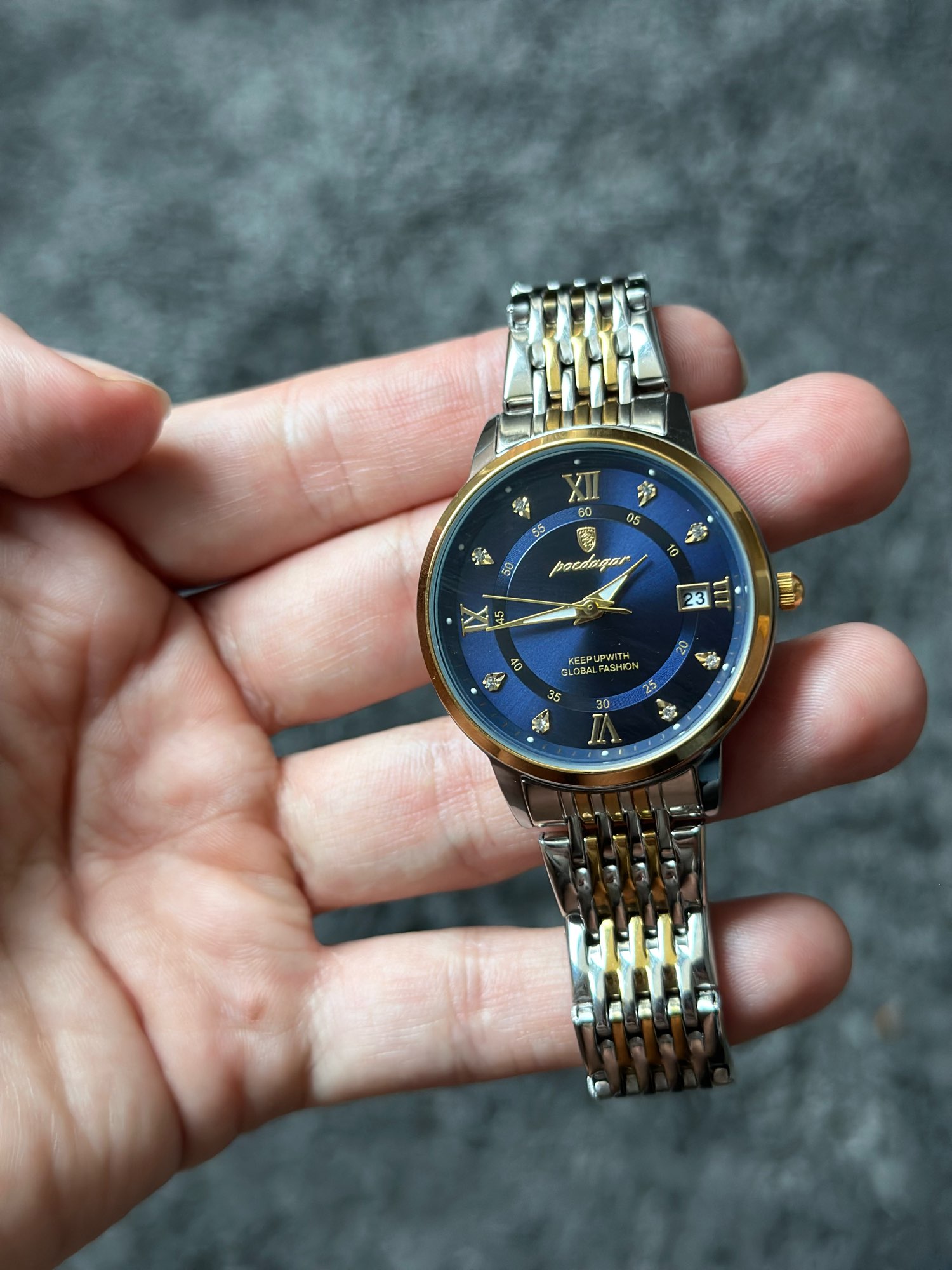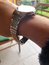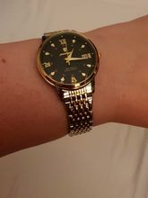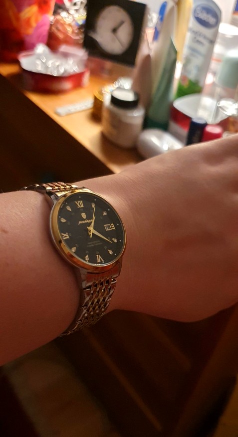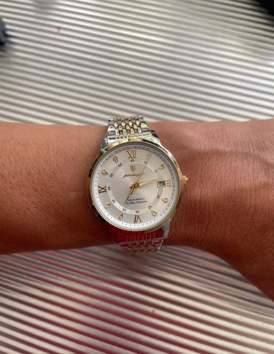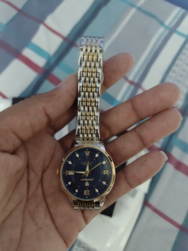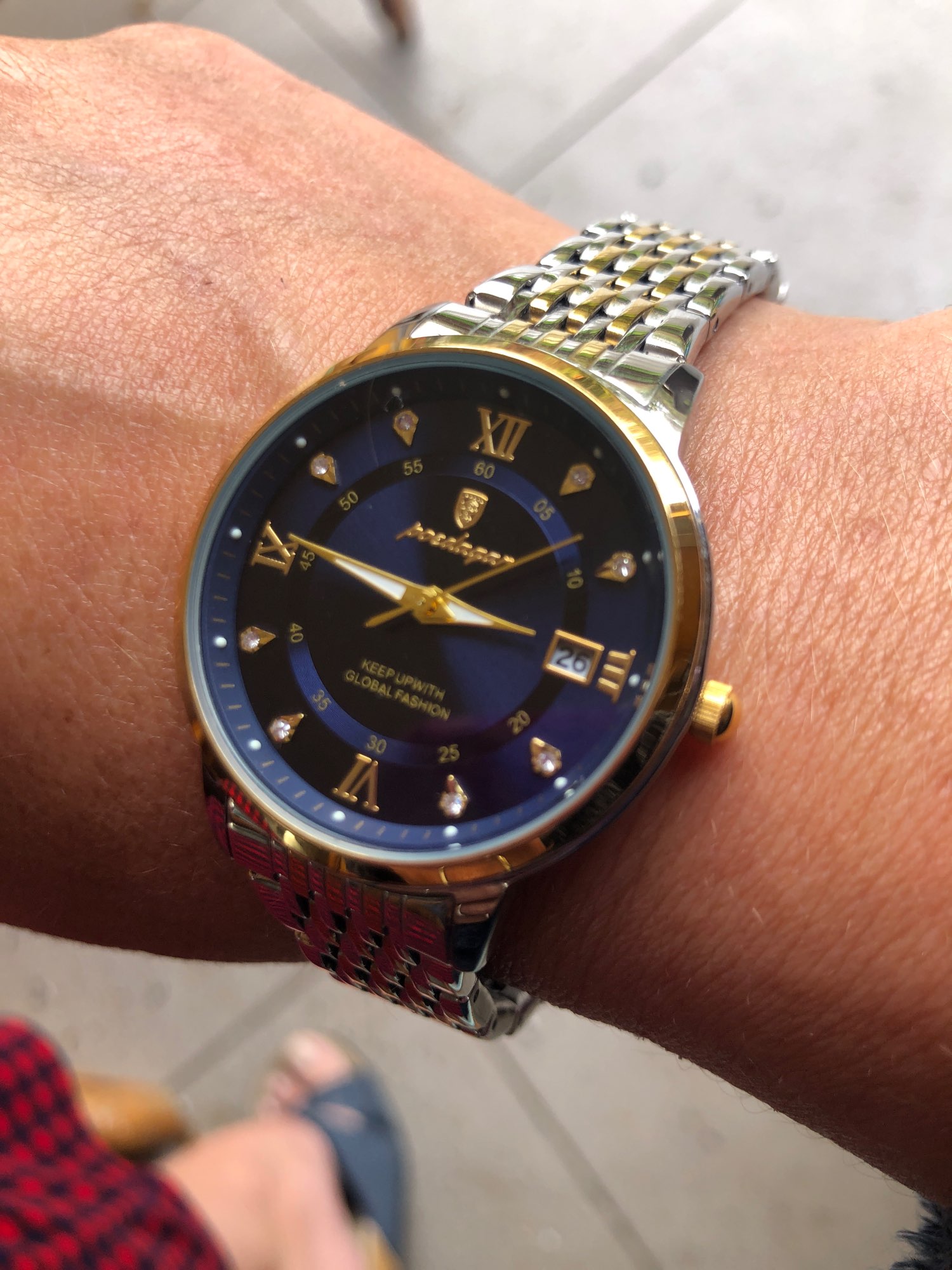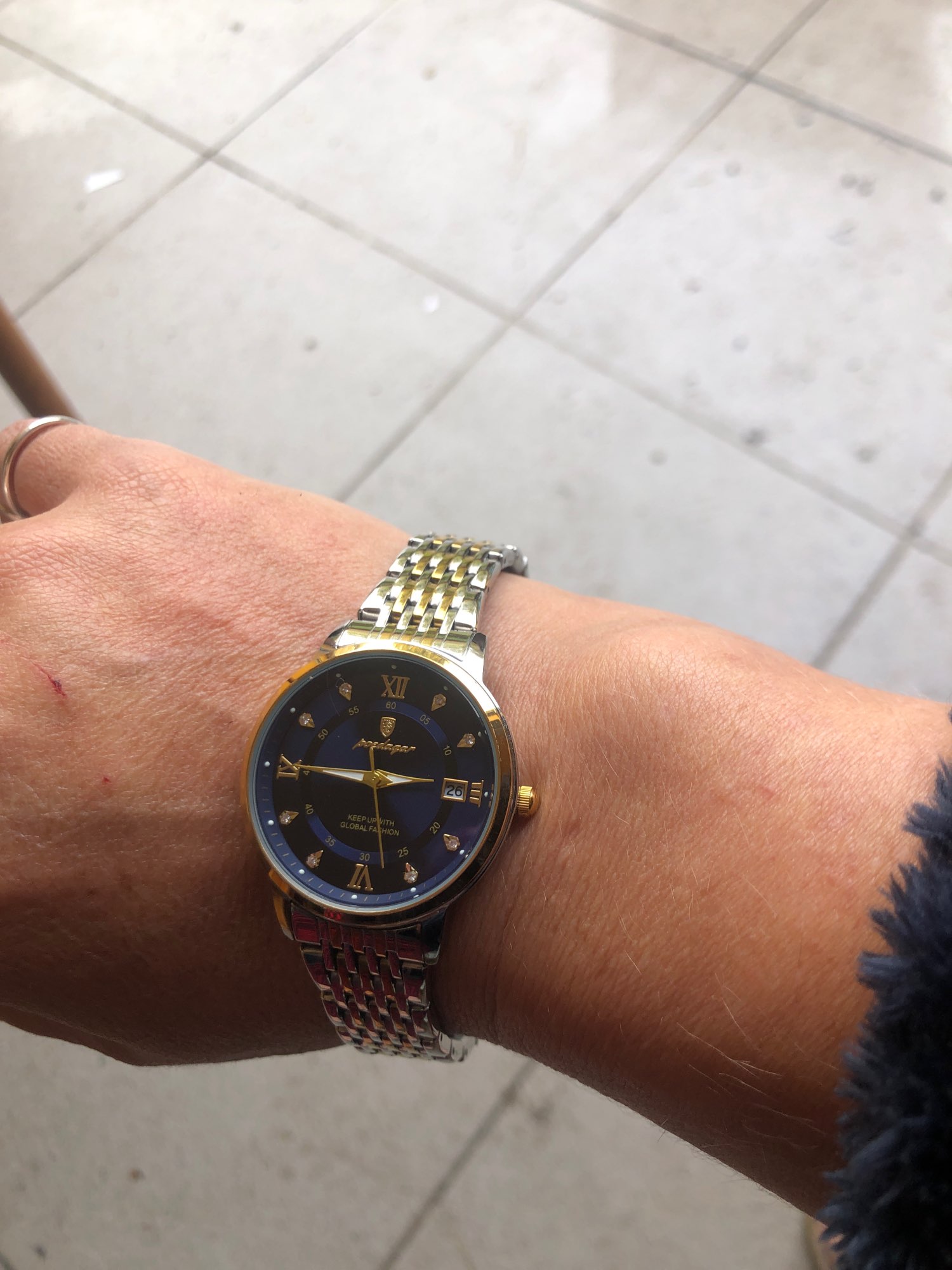 A very nice watch! Clean, clear and lovely time and calendar display. Came with a bracelet adjuster, a spare battery and a tiny cloth for cleaning. Thanks, Sellers. I recommend both the watch and the Seller.