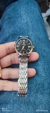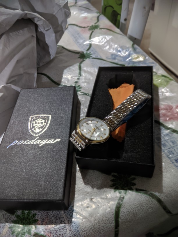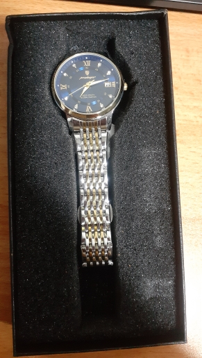 Received the parcel a couple of days earlier than the announced one, the store paid for the services of the new mail, the parcel office. Everything is fine, there is fabric, there is a device for removing links, I will not risk it myself, I will go to the master better)))). The box is slightly damaged, if for a gift, it would be rebuilt, I don't know because of whose fault, the seller or deliveries, Mail. The clock went on, worked on the way.
