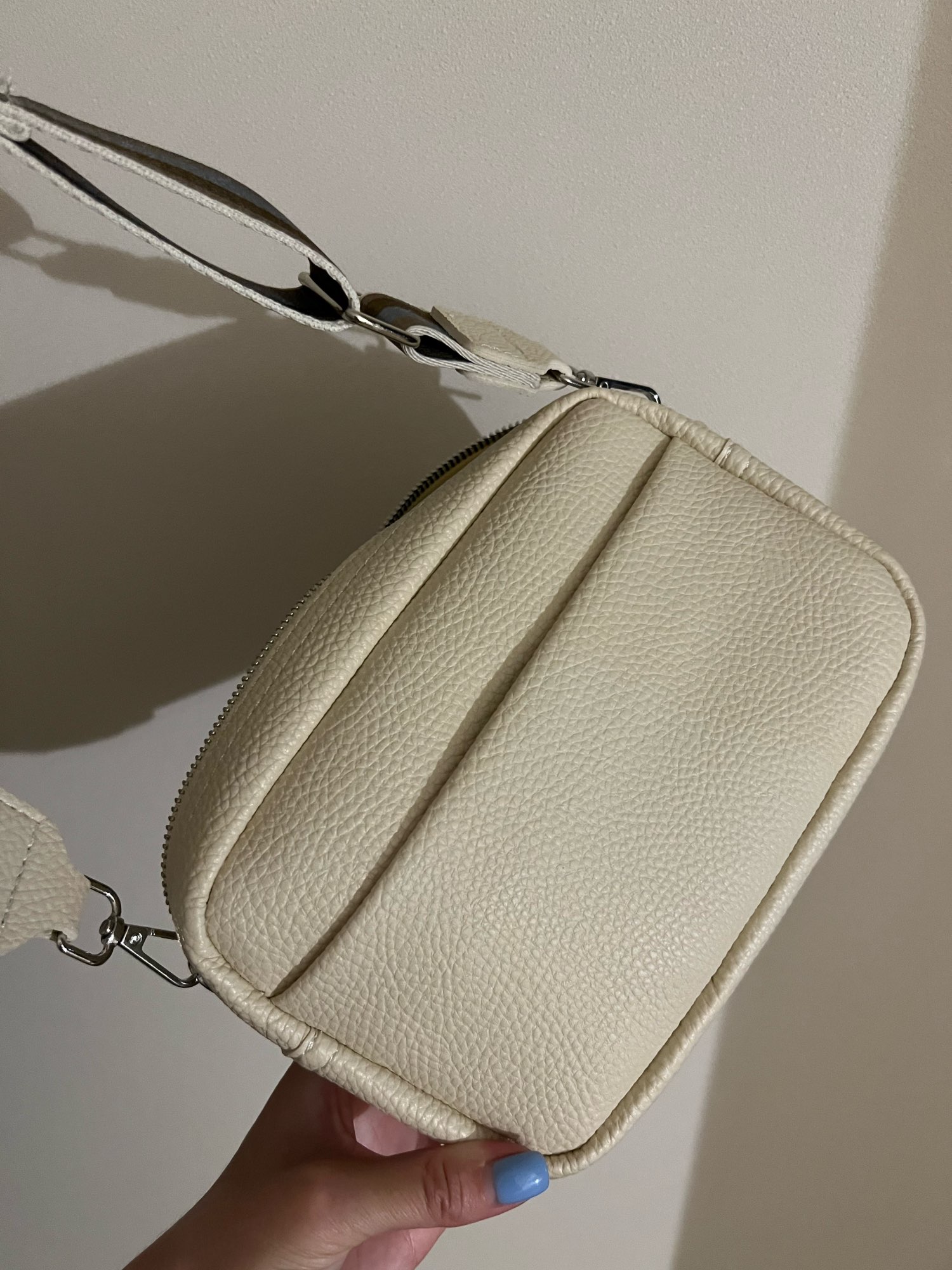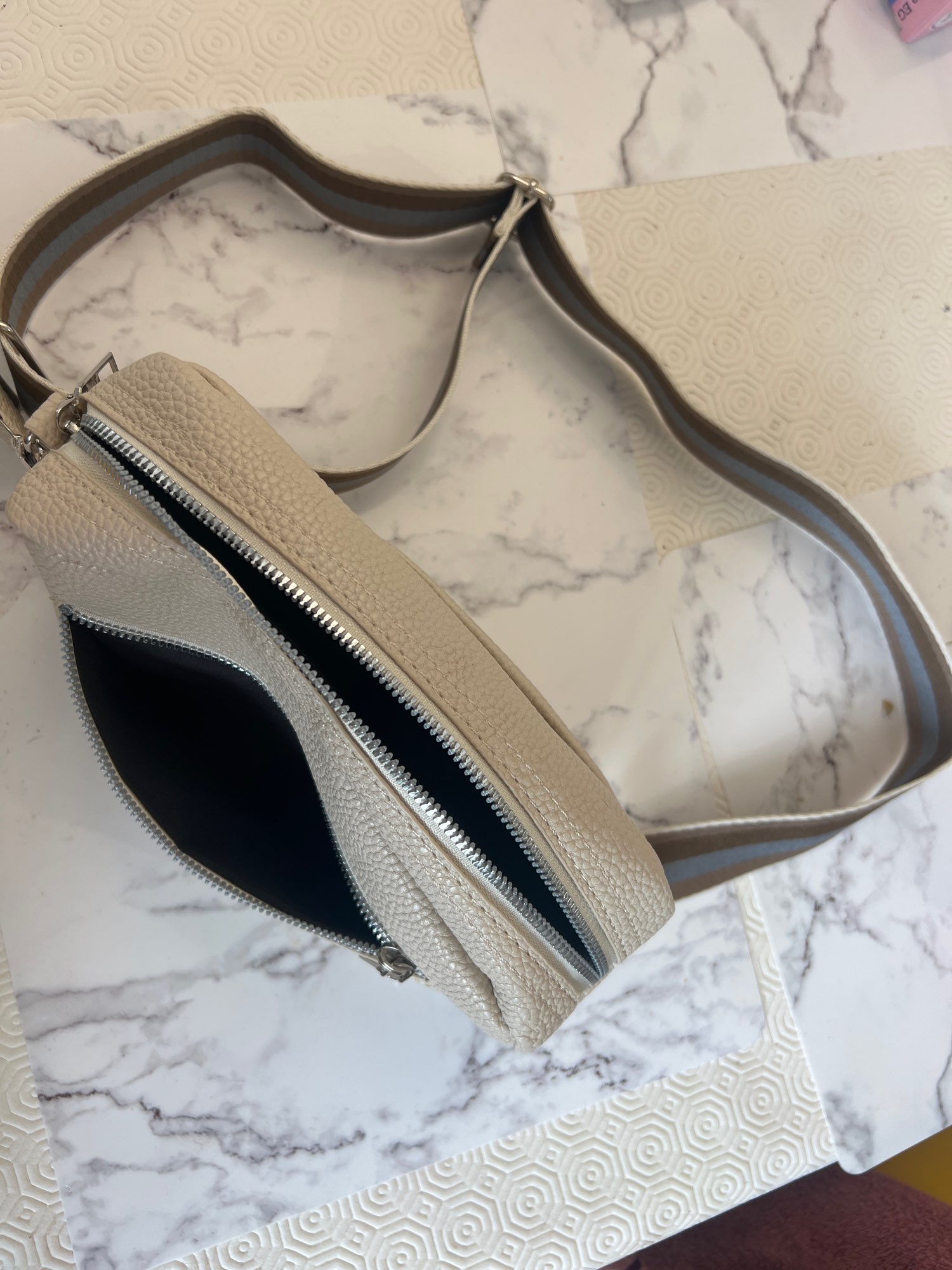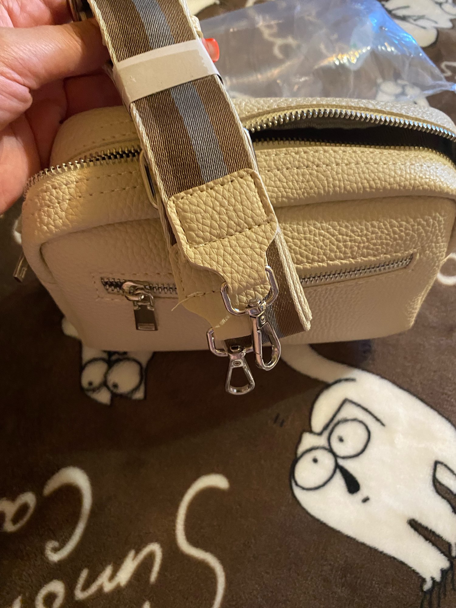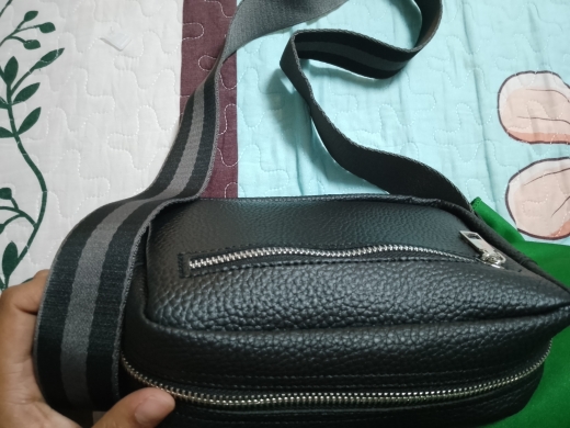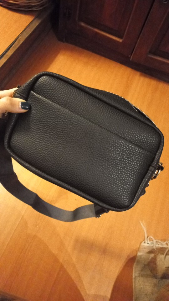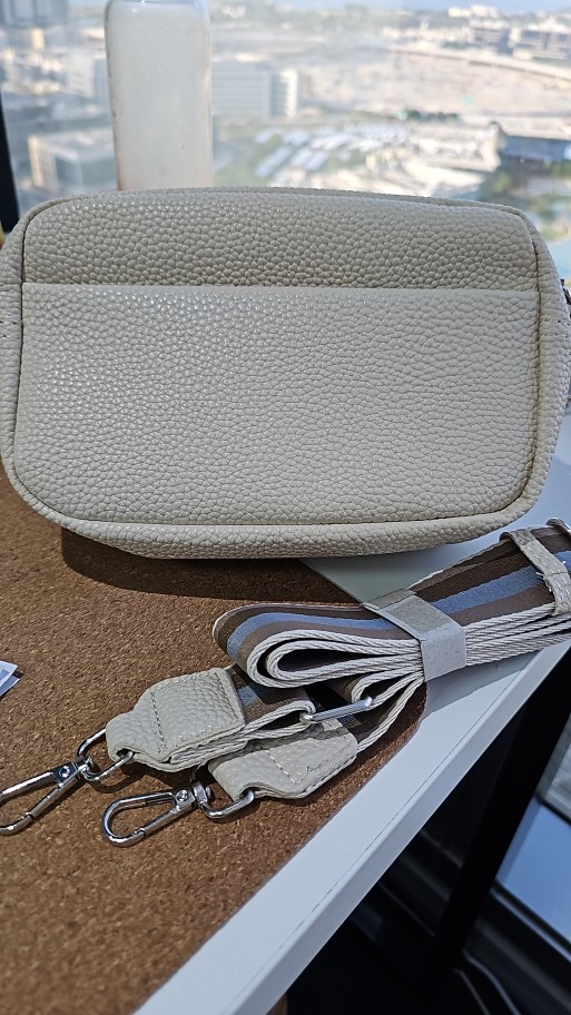I'm satisfied with the bag. Small but large beautiful shoulder strap