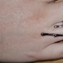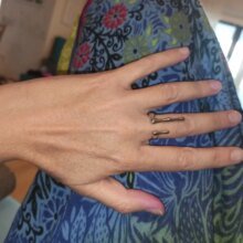 It took a lot of adjusting and bending so that the long part stays on the finger and its tip does not stick out. Now it looks really nice. (My hands are big )