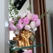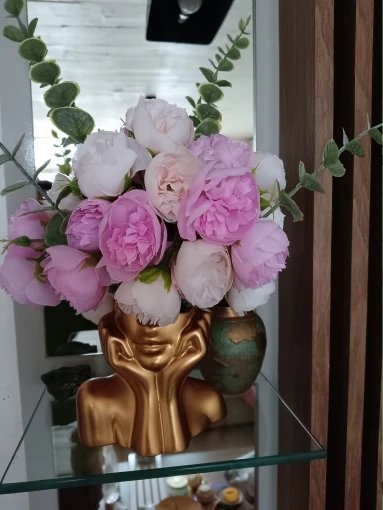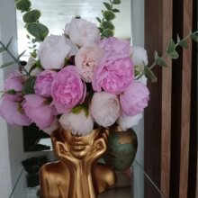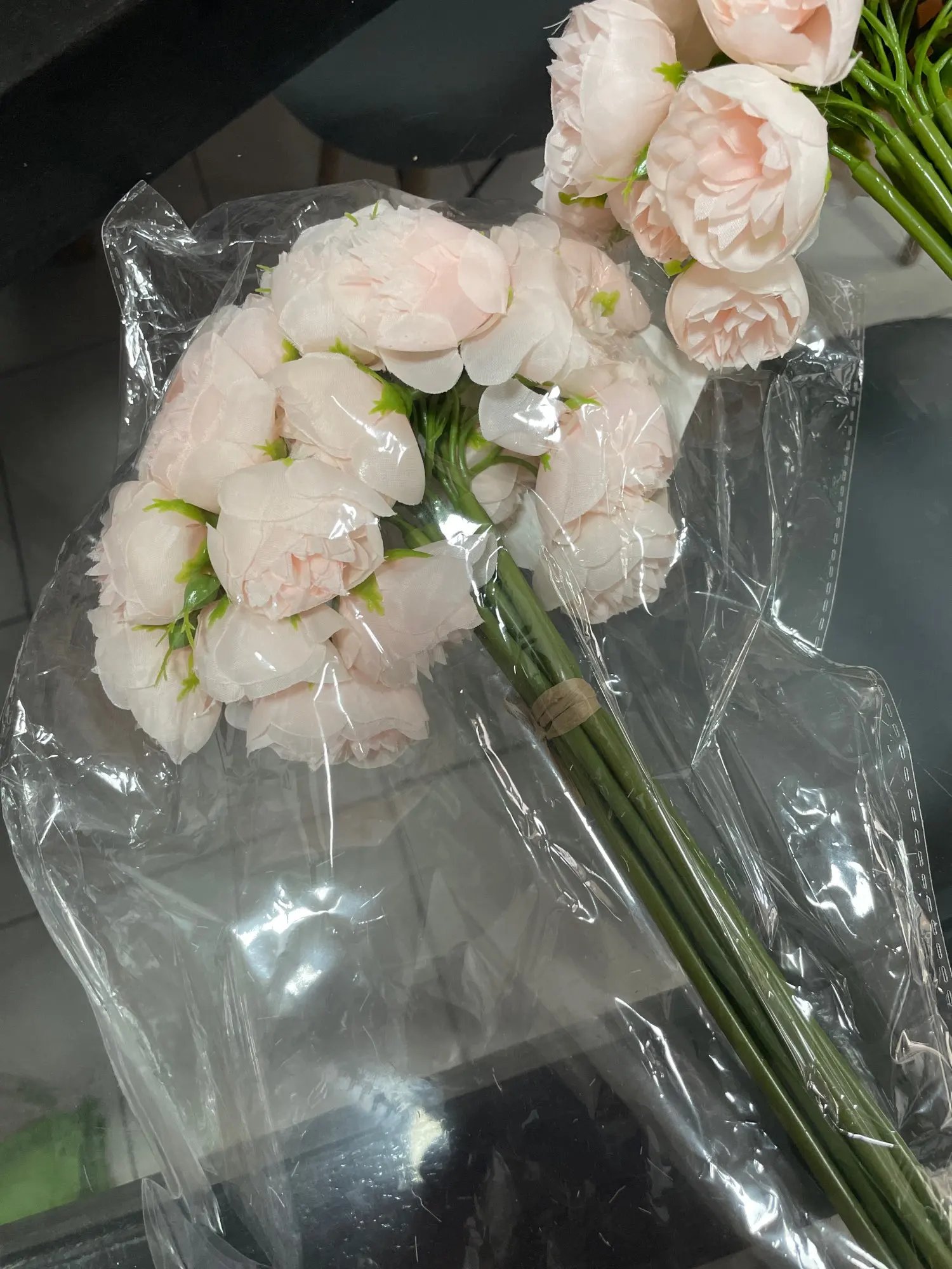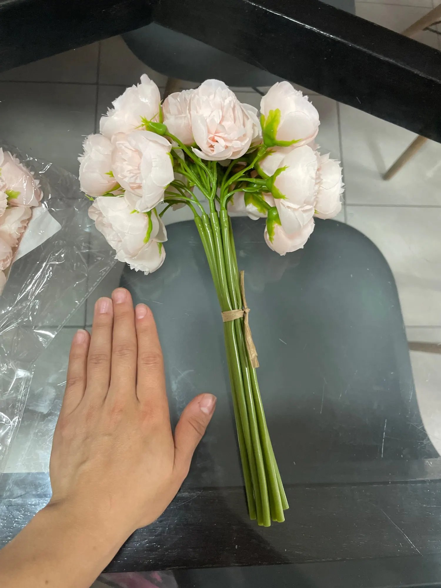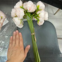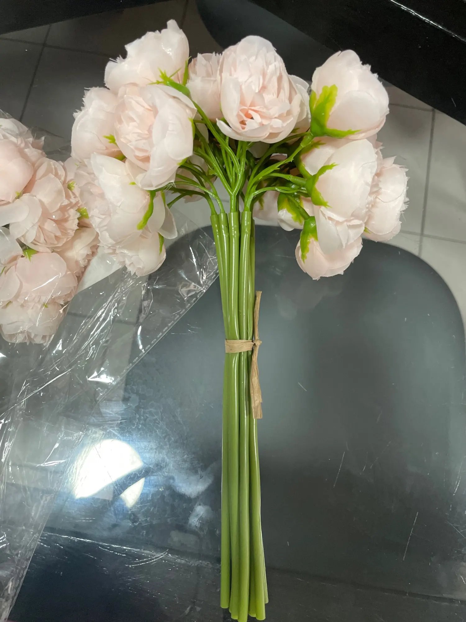Joli bouquet de pivoines artificielles sur tiges. Arrivées un peu écrasées mais se remettent facilement en place.