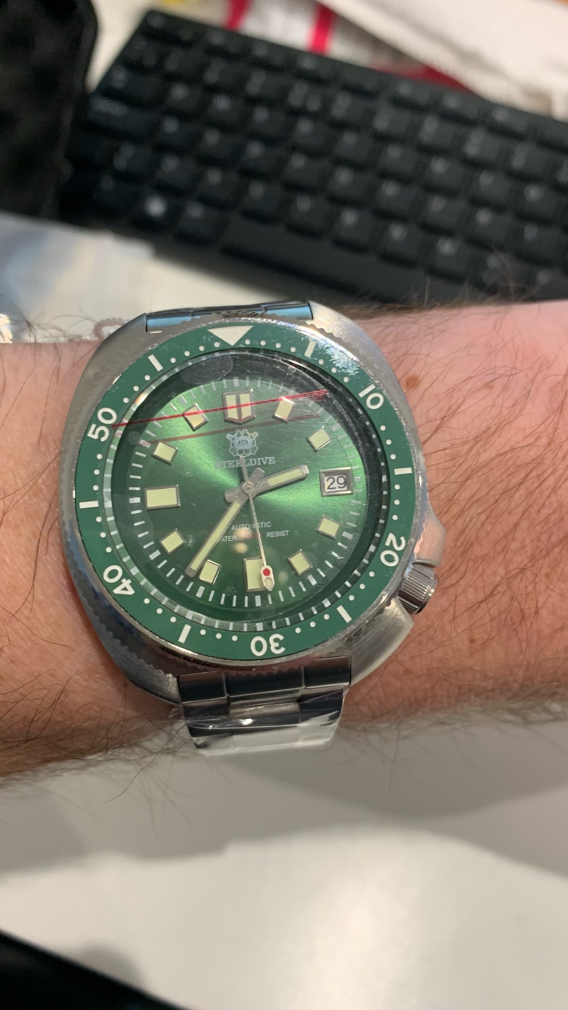 I still can't believe it a tremendous watch that I received for what I pay, without a loss it has become one of my favorite watches, just waiting for the green to reach me. I really congratulate the buyer very reliable and fast delivery