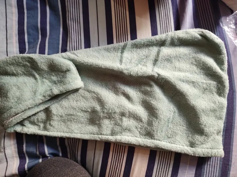 Llego una semana antes de lo previsto. Esta bonita y suave. Me hubiera gustado que fuera un poco más larga y amplia ya que tengo el cabello muy largo y abundante, tuve que enrollarlo super bien para que pudiera entrar todo y pudiera abrocharse.