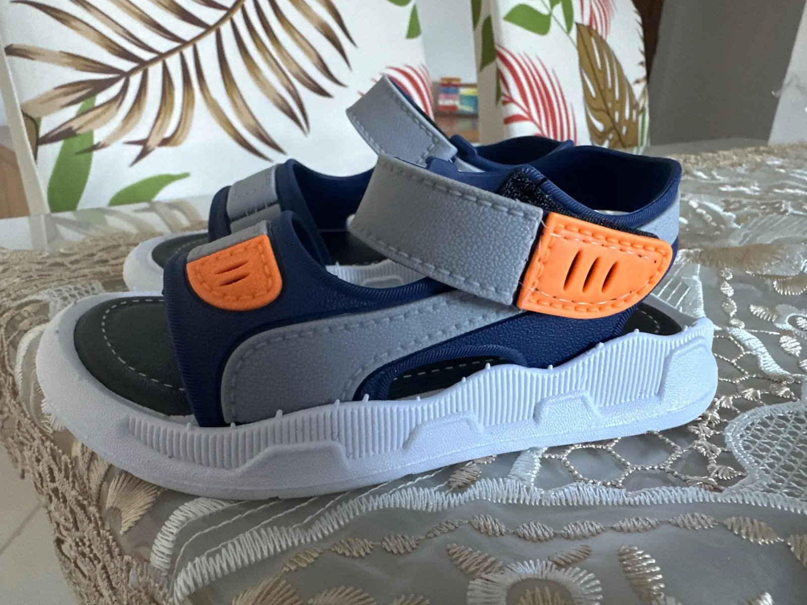 Exatamente igual a foto do anúncio. Meu filho tem 2 anos e 2 meses, seu pé é grande e gordinho, o tamanho 24 deu com pouca folga. A sola do calçado não é emborracha fofinha, então acredito que incomode para uma caminhada longa, mas cumpre para o que foi comprado, passeios curtos.