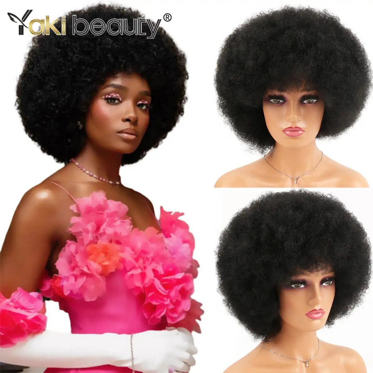 Synthetic Afro Kinky Curly Wig With Bangs Big 70s Soft Afro Wig For Black Women Machine Made Cosplay Wig Natural Brown Black