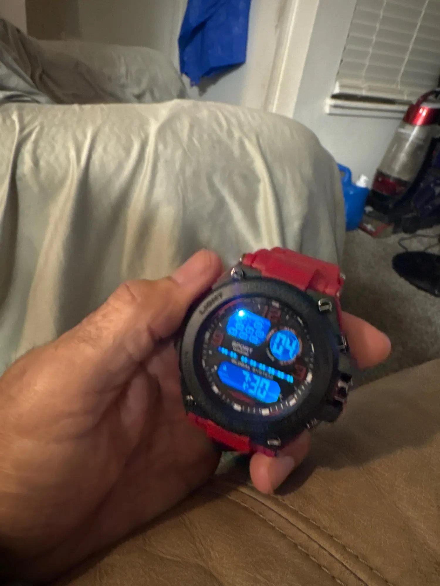 Is a very big watch, very notice able. Lighted display shuts of seconds after pressing side switch. Feels sturdy for good hard workers. I’ll be using this one a lot. It has the analog numbers as if was also with hand pointers but is strictly a digital watch. It doesn’t have both. I’ll enjoy wearing it as well…..