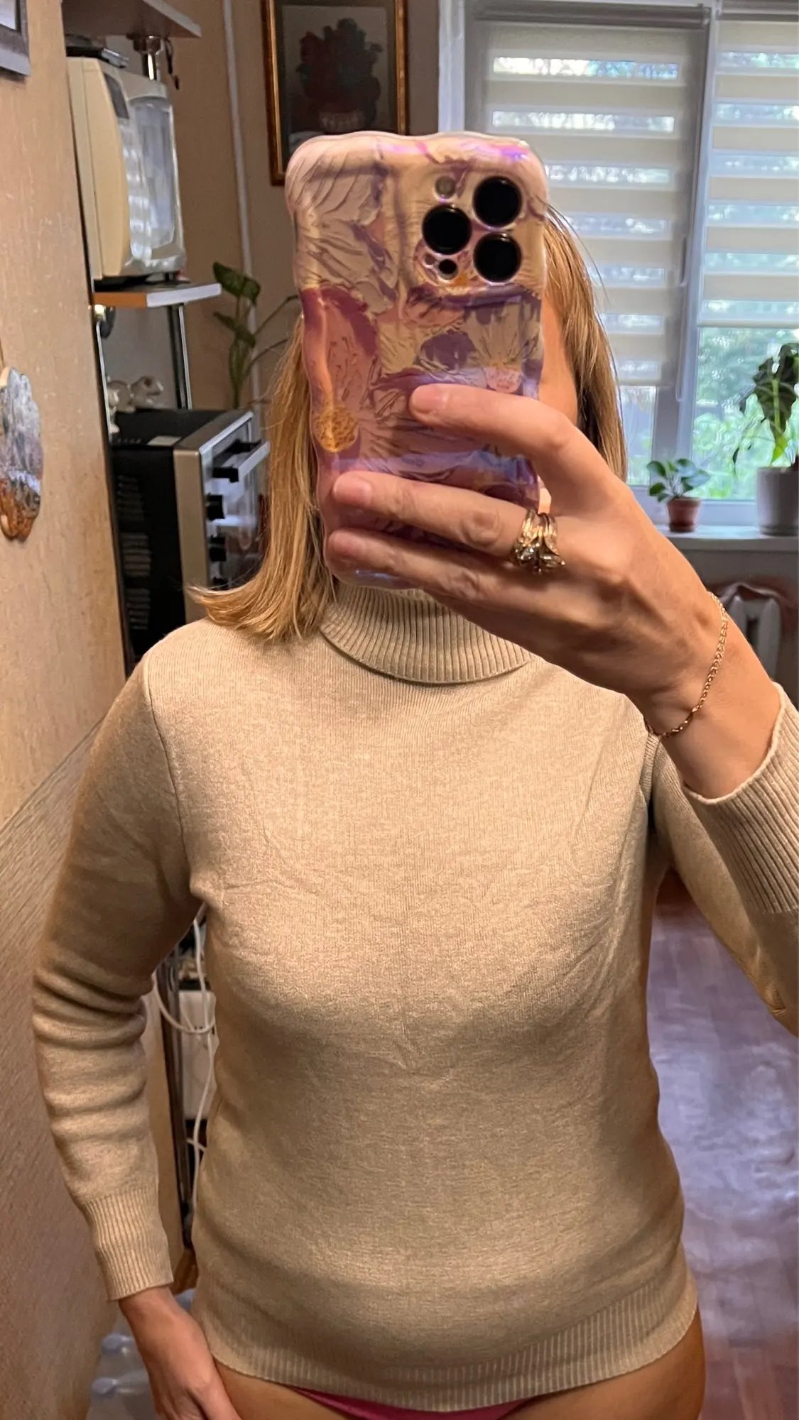 Good warm golf. Thread sticks out a little. The underside is insulated. Color as the store's photo. For 162 growth and parameters 89-74-95 size XL sat down well. After socks I will add feedback.