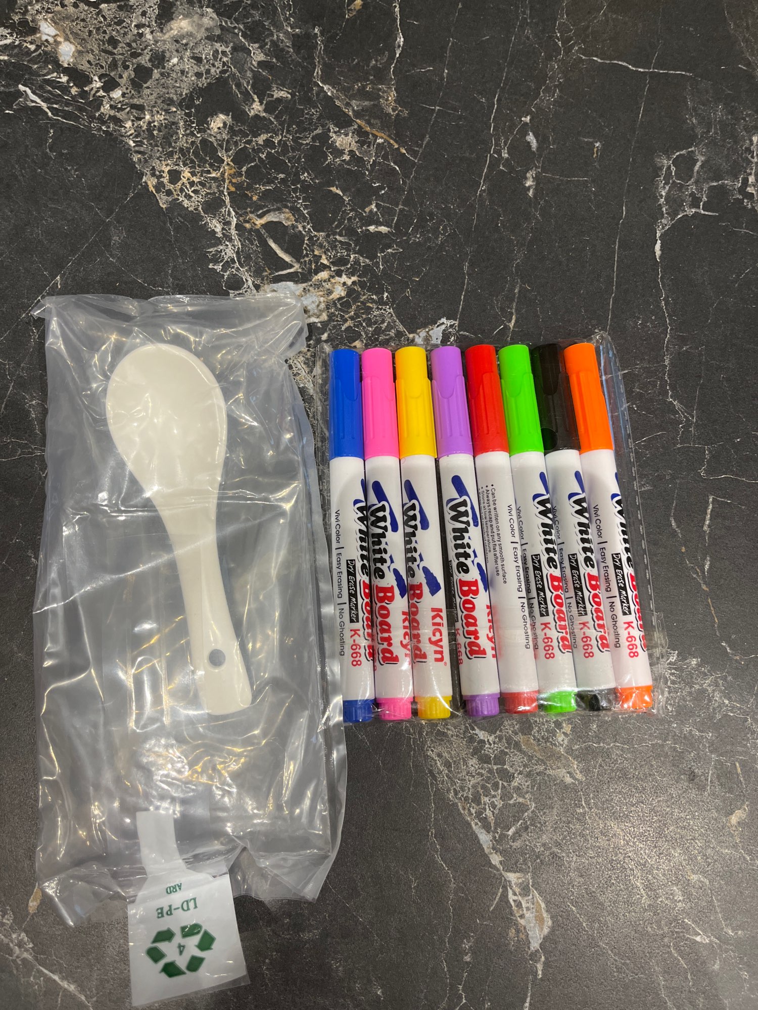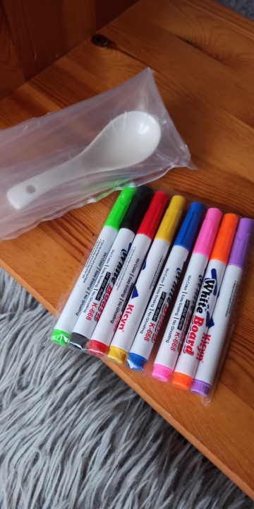 trochę długo na to czekałam ale dzisiaj w końcu przyszło i jestem zadowolona, z początku rysunki na łyżce nie chciały zostawać na wodzie ale okazało się że po prostu wystarczy umieć to zrobić, No ale później gdy się już nauczyłam to wszystko jest ok, tanie i fajne, dobra jakość markerów, polecam