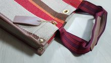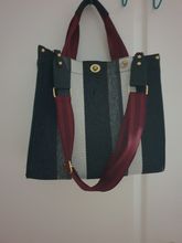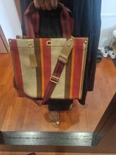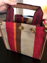 Small, it has a small bag inside and long handles to hang on the shoulder.