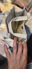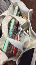The bag is very cute, but alas, the quality disappointed me. Opened a dispute for half the cost of the bag, the store agreed to return the money. I fit in it: a notebook A5, a bottle of water 0.7, a small wallet and headphones. The bag is fastened as in 1 photo. Also, if you do not fasten it, then you can put a large pencil case, glasses in a case and a shopper :) I hope that in the future the seller will be more attentive to the quality of the seams. Then there will be no problems at all!