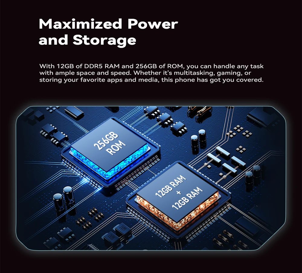With 12GB of DDR5 RAM and 256GB of ROM, you can handle any task with ample space and speed, Whether it’s multitasking, gaming, or storing your favorite apps and media, this phone has got you covered.