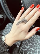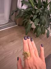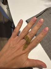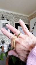 Superbe bague chaînette dorée Ne gêne absolument pas pour travailler et n'accroche pas du tout Je recommande vivement si vous aimez les bijoux Hors norme